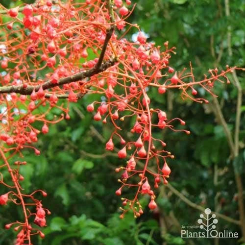 DESCRIPTION: Deciduous Australian native tree with a rounded habit and maple-like foliage. Leaves fall during the dry season. Bell shaped flame-red flowers follow in clusters during spring-summer.