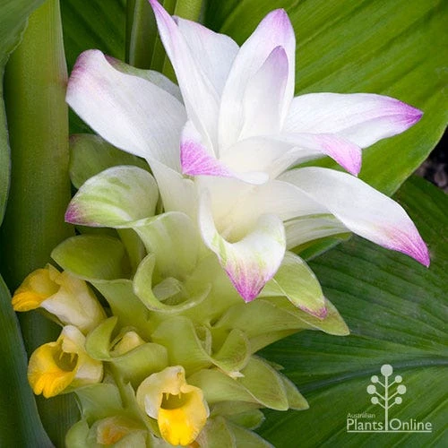 Attractive lush subtropical plant which likes it warm and wet. Cream-white flowers shaded with pink, and big broad leaves. Spice from the roots is used in cooking (especially curry) and herbal medicine.